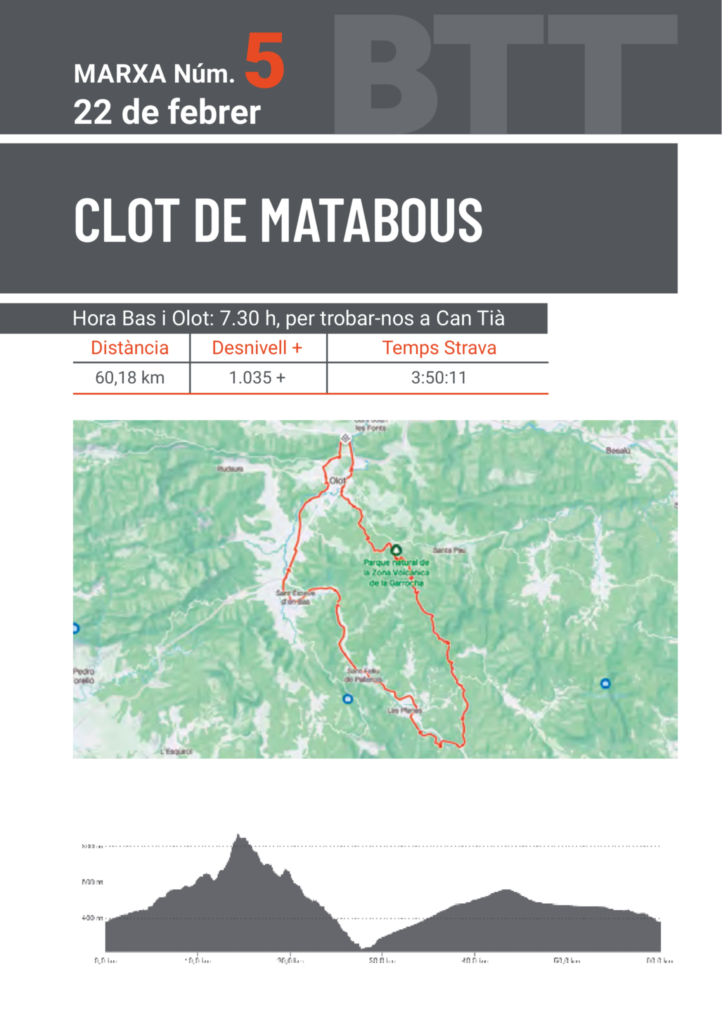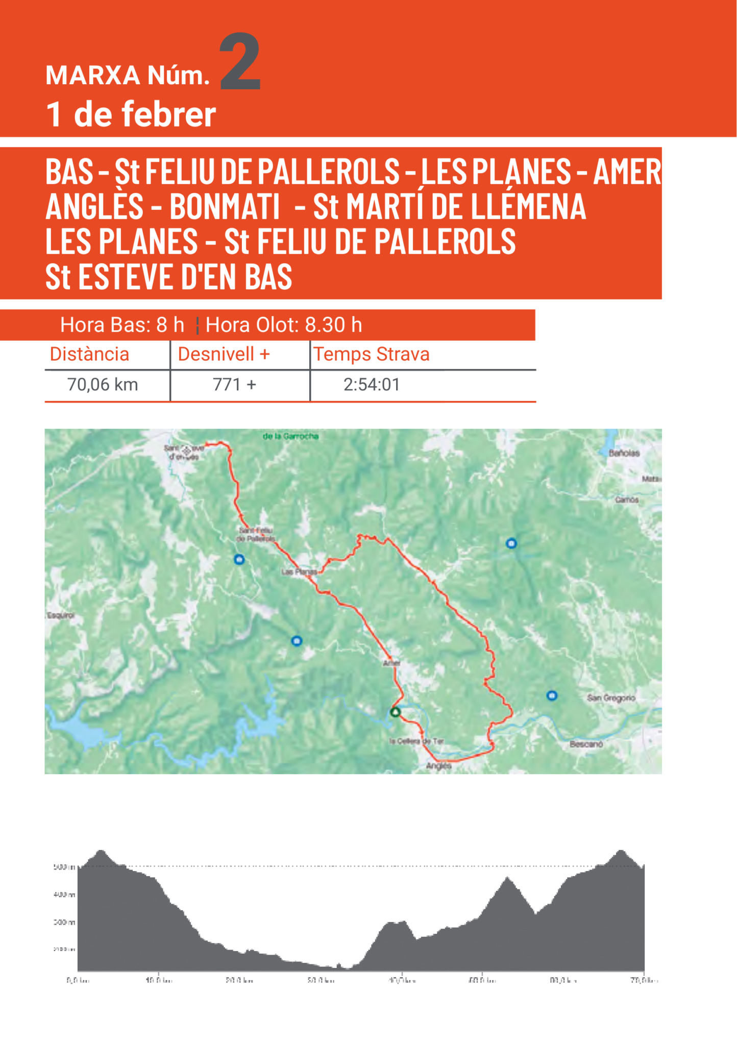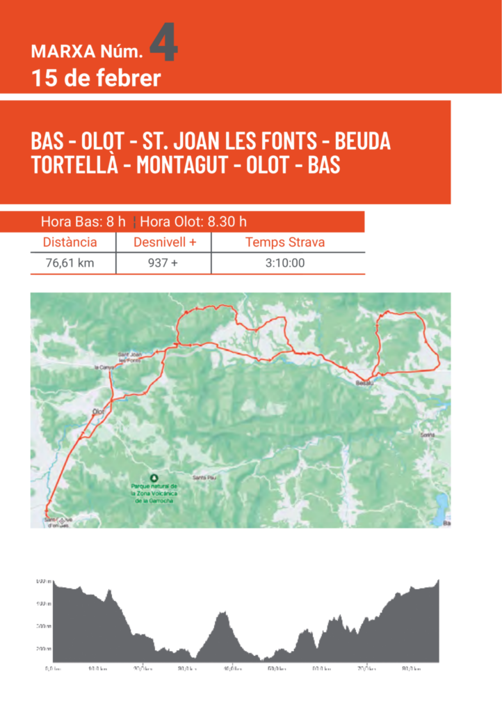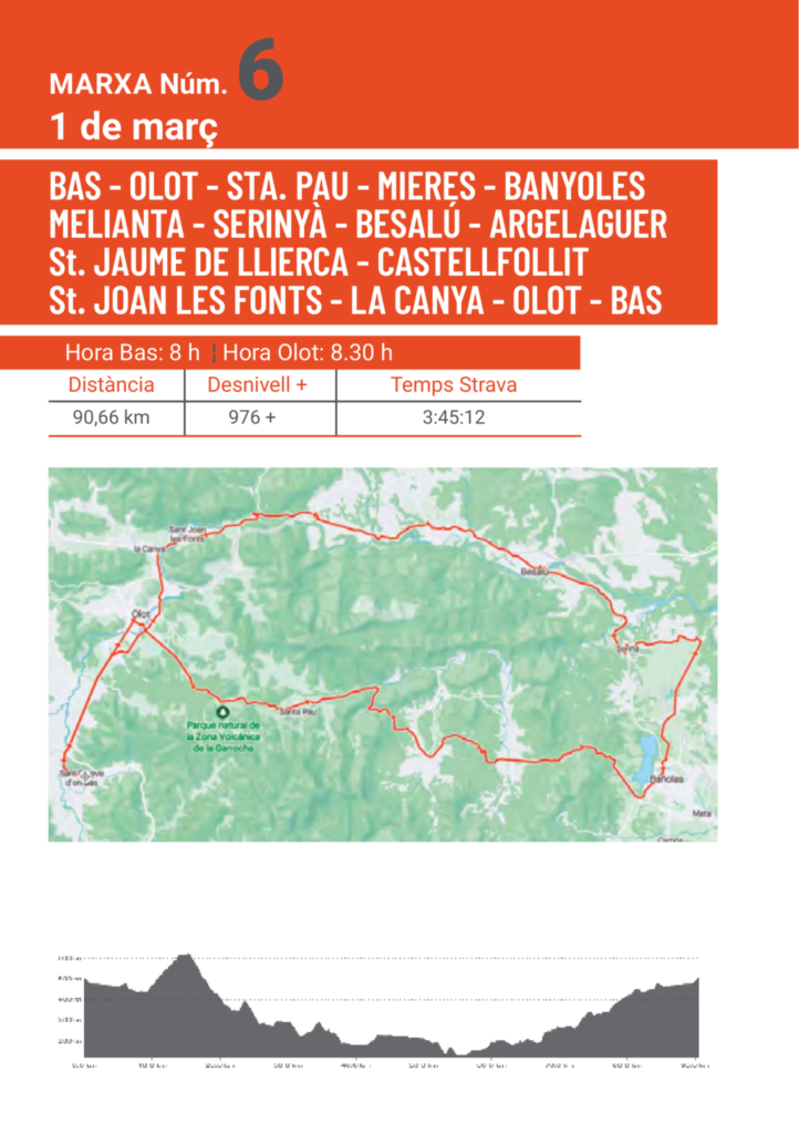 - Las salidas de Olot se harán en la Plaza Clarà (Quiosco del Parque) y las d’En Bas, desde la plazoleta o de la calle Ancha, en función del itinerario, ambas con rigurosa puntualidad.